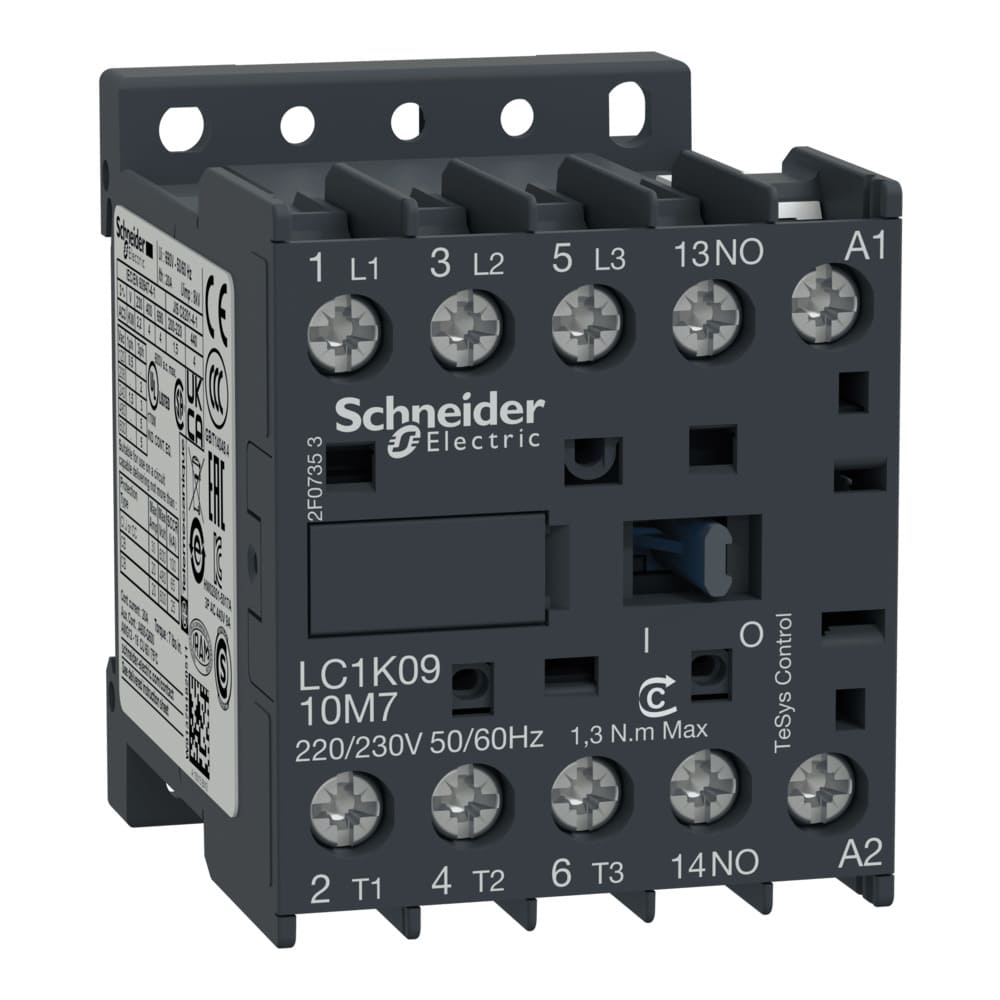 Contactor TeSys K, 3 polos (3 NA), para aplicaciones de control de motores de hasta 9 A/690 V CA-3 (4kW@400V), y para aplicaciones de control de cargas no inductivas de hasta 20A/690V CA-1. Proporciona una bobina de CA de 220V y 50/60Hz, contacto auxiliar integrado 1NA, conexión mediante terminales de borne atornillado. Para velocidades de funcionamiento hasta 600 ciclos/hora y entornos hasta 50°C, ofrece fiabilidad y durabilidad a las aplicaciones estándar. Muy compacto (45mm de ancho), montaje en riel DIN o fijación con tornillos. Certificación de múltiples estándares (IEC, UL, CSA, CCC, EAC), conformidad con Green Premium (RoHS/REACh).